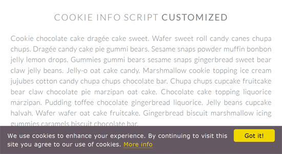 Further more you can modify the banner appearance (div.cookieinfo) and close button (.cookiebanner-close) via CSS. Please keep in mind that you might have to override and or reset certain properties by using !important CSS rules.
