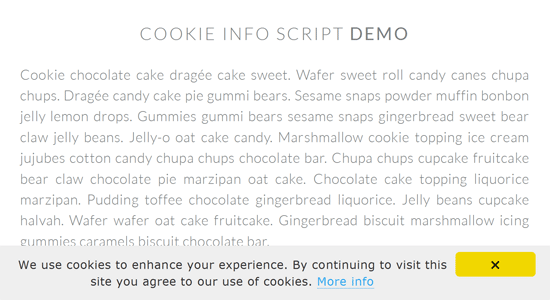 Self-hosting: If you don't want to depend on cookieinfoscript.com you can copy the cookieinfo.min.js directly to your site. But keep in mind that you will miss out this way on all updates and critical fixes. Please make sure to subscribe to our Twitter and Facebook channel in this case.
